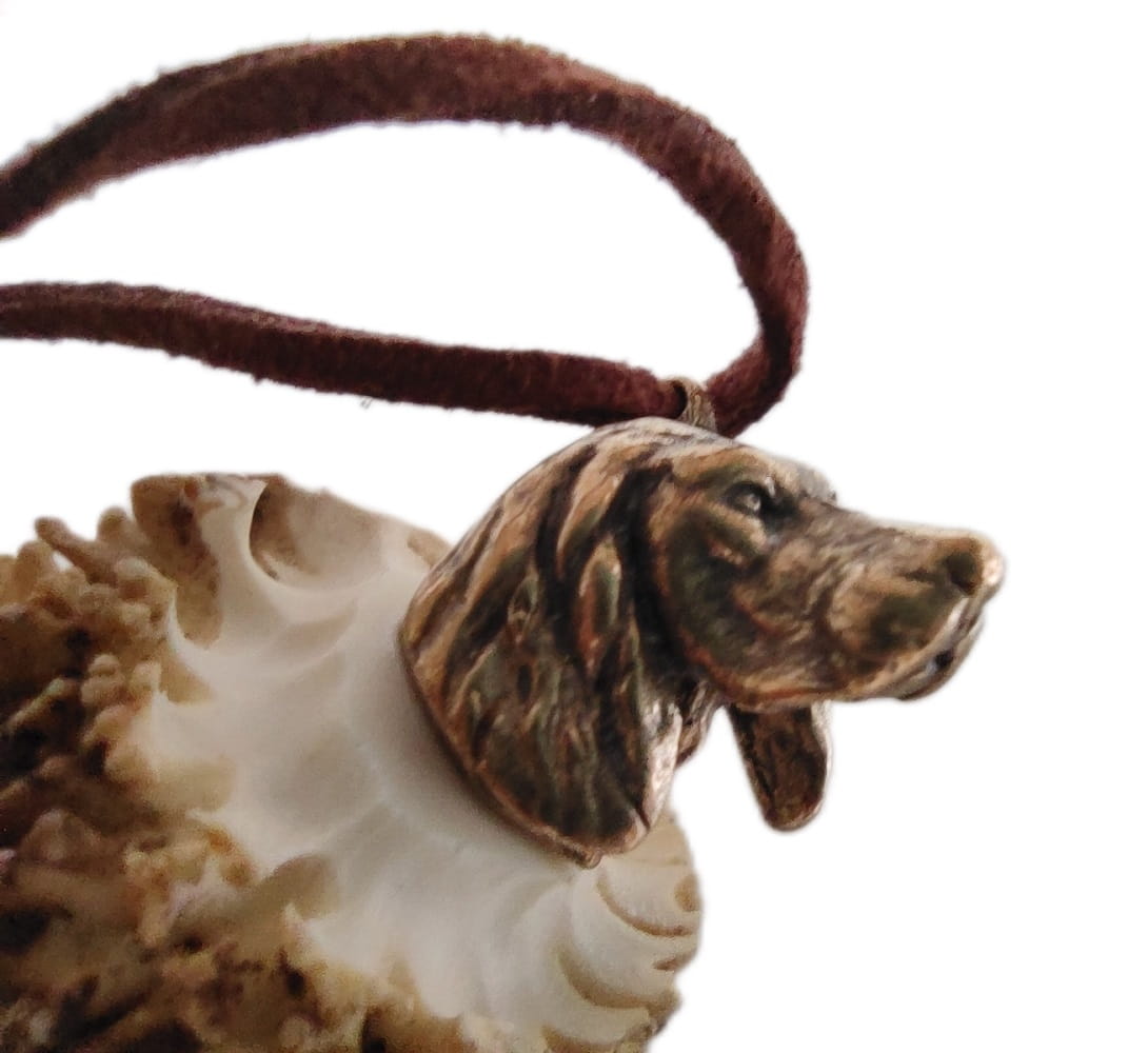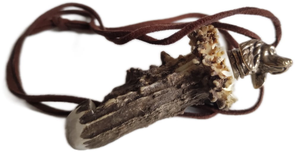 Gwizdek na rogu z głową psa. Ozdoba odlana z brązu