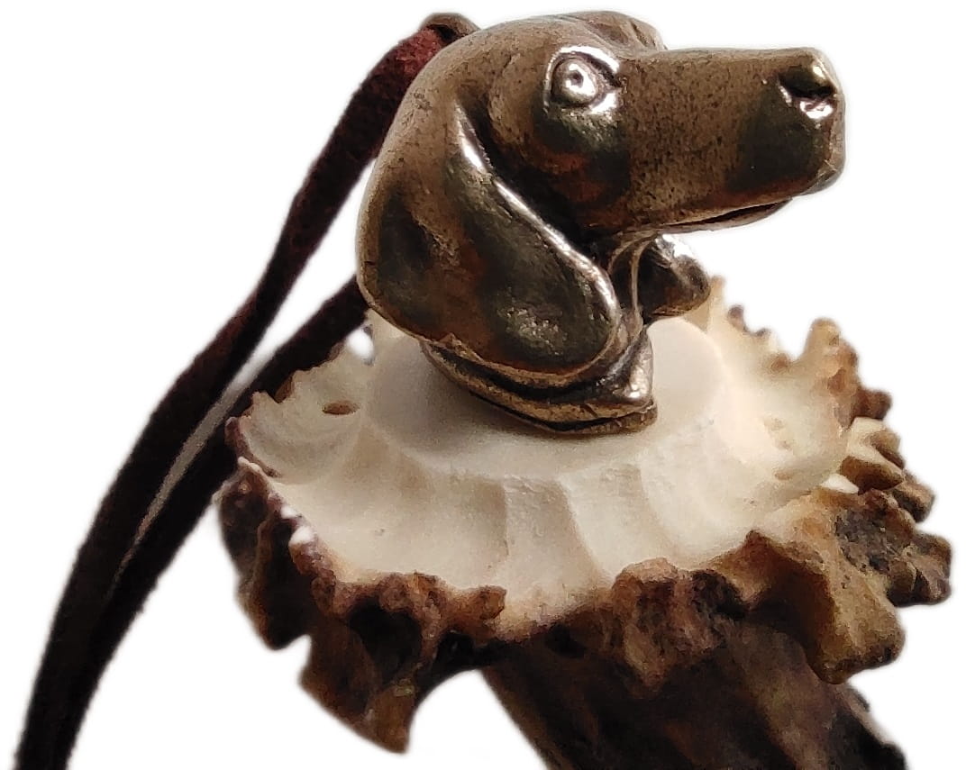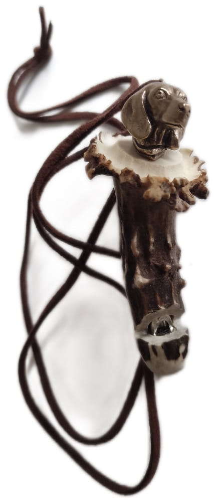 Gwizdek na psa wykonany na rogu z motywem głowy psa. Ozdoba została odlana z brązu.
