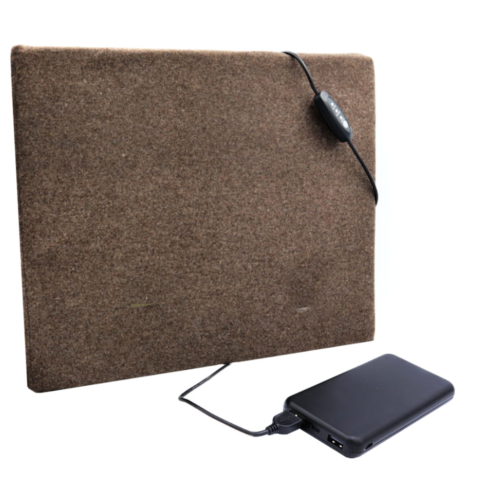 Produkt zasilany z portu USB-C. Grzanie może odbywać się za pomocą powerbanka 5V, dołączonego do zestawu. Poduszka posiada pilot do sterowania mocą grzania. Przycisk Włącz/Wyłącz odpowiada za uruchomienie po jednym kliknięciu grzania i ustawienie na poziomie "high" (wysoki). Każde następne kliknięcie reguluje grzanie maty. Całkowite wyłączenie następuje, gdy dioda świeci się na polu "low" (niskie).
