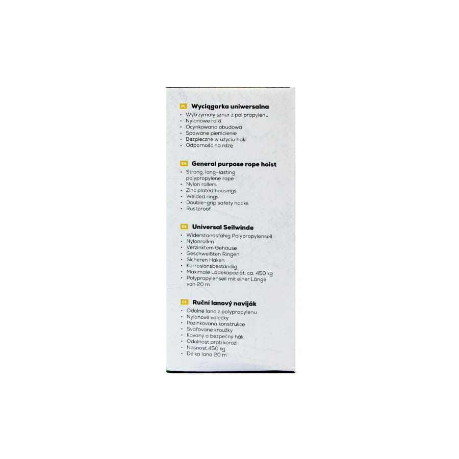 Obudowa wciągarki została wykonana ze stali, natomiast 4 bloczki z wytrzymałego polimeru, podobnie jak lina o długości 20 metrów. Taka konstrukcja gwarantuje bezawaryjne użytkowanie przez wiele lat.